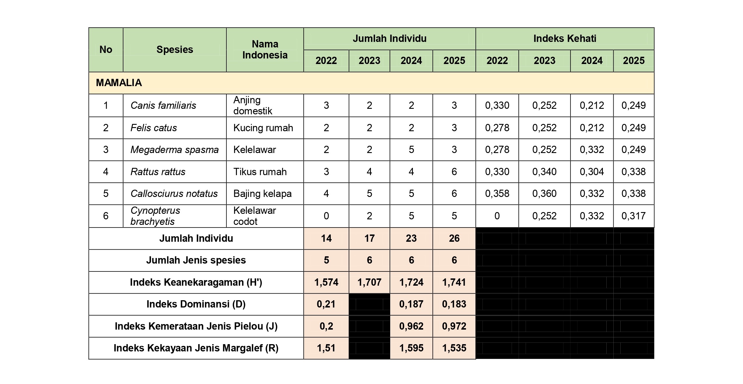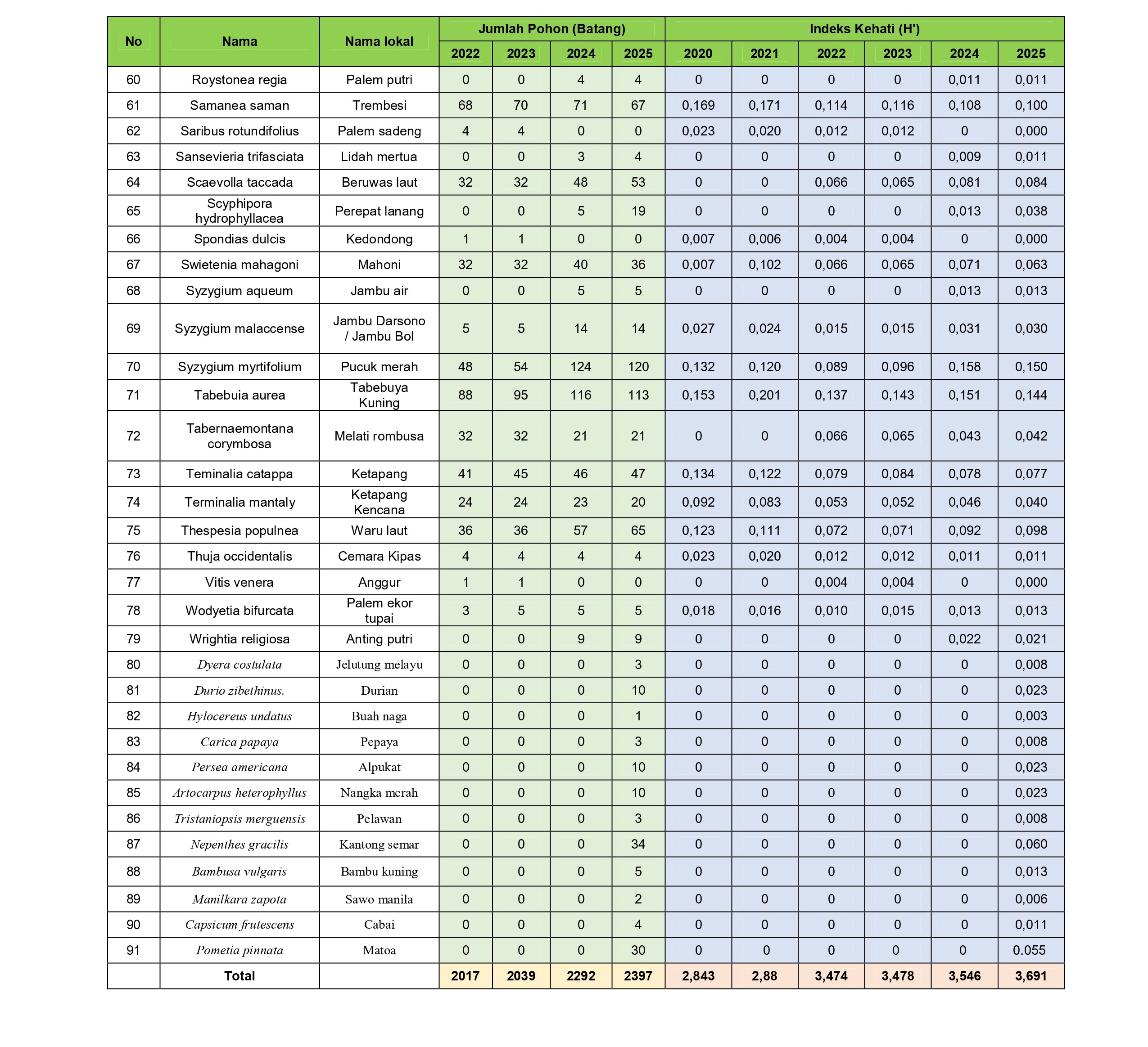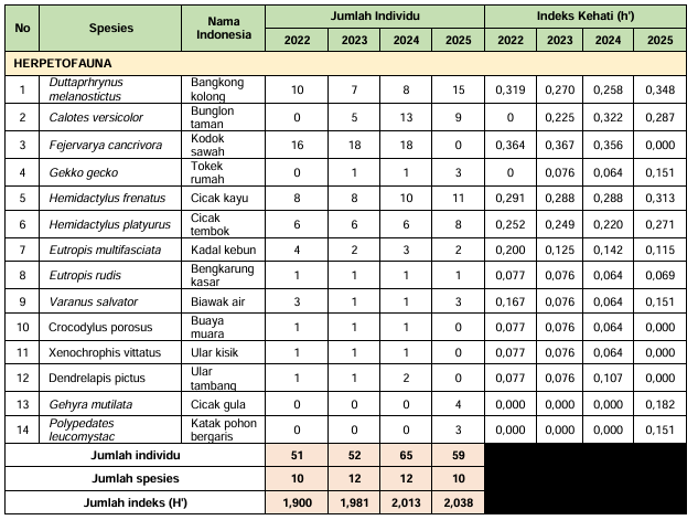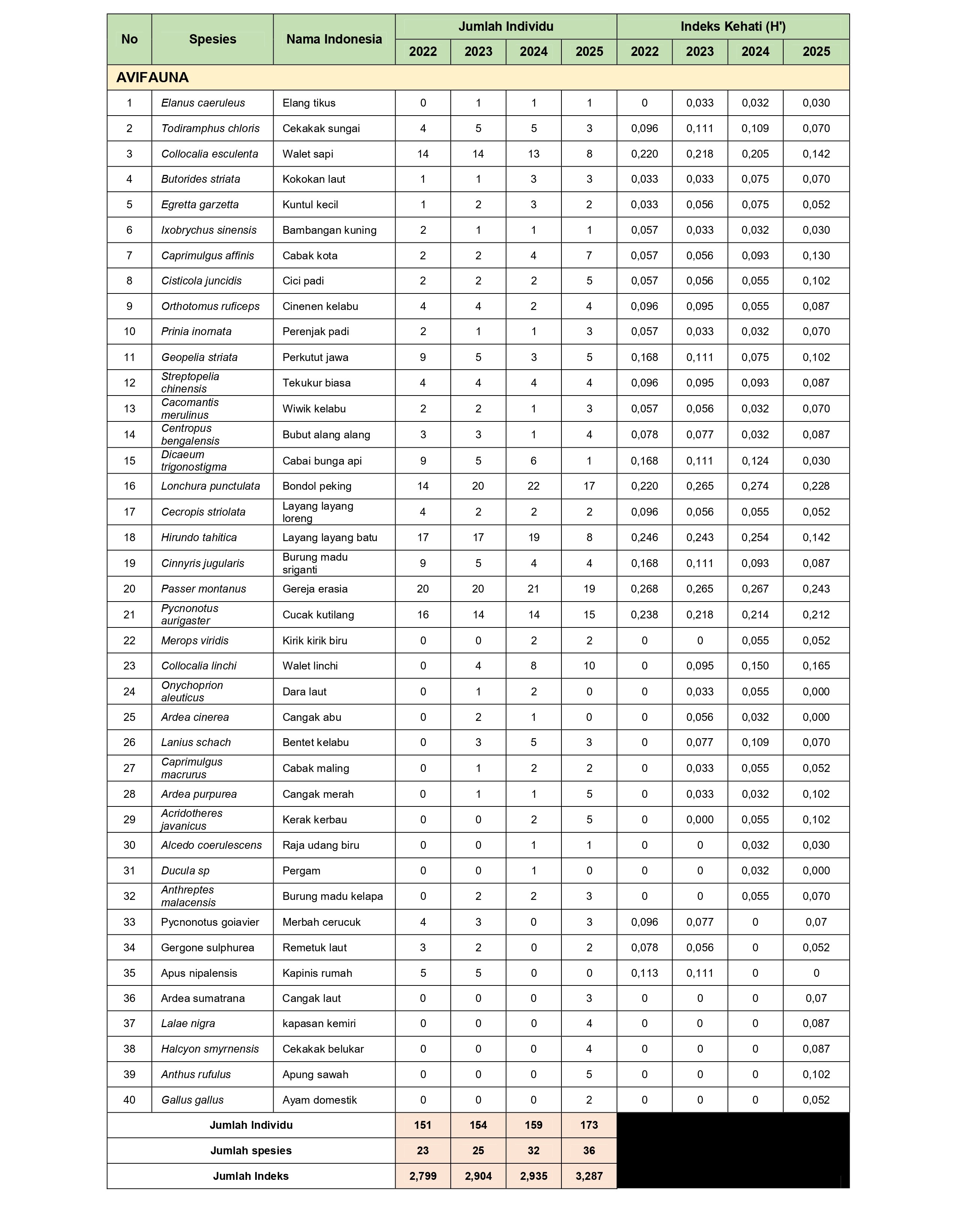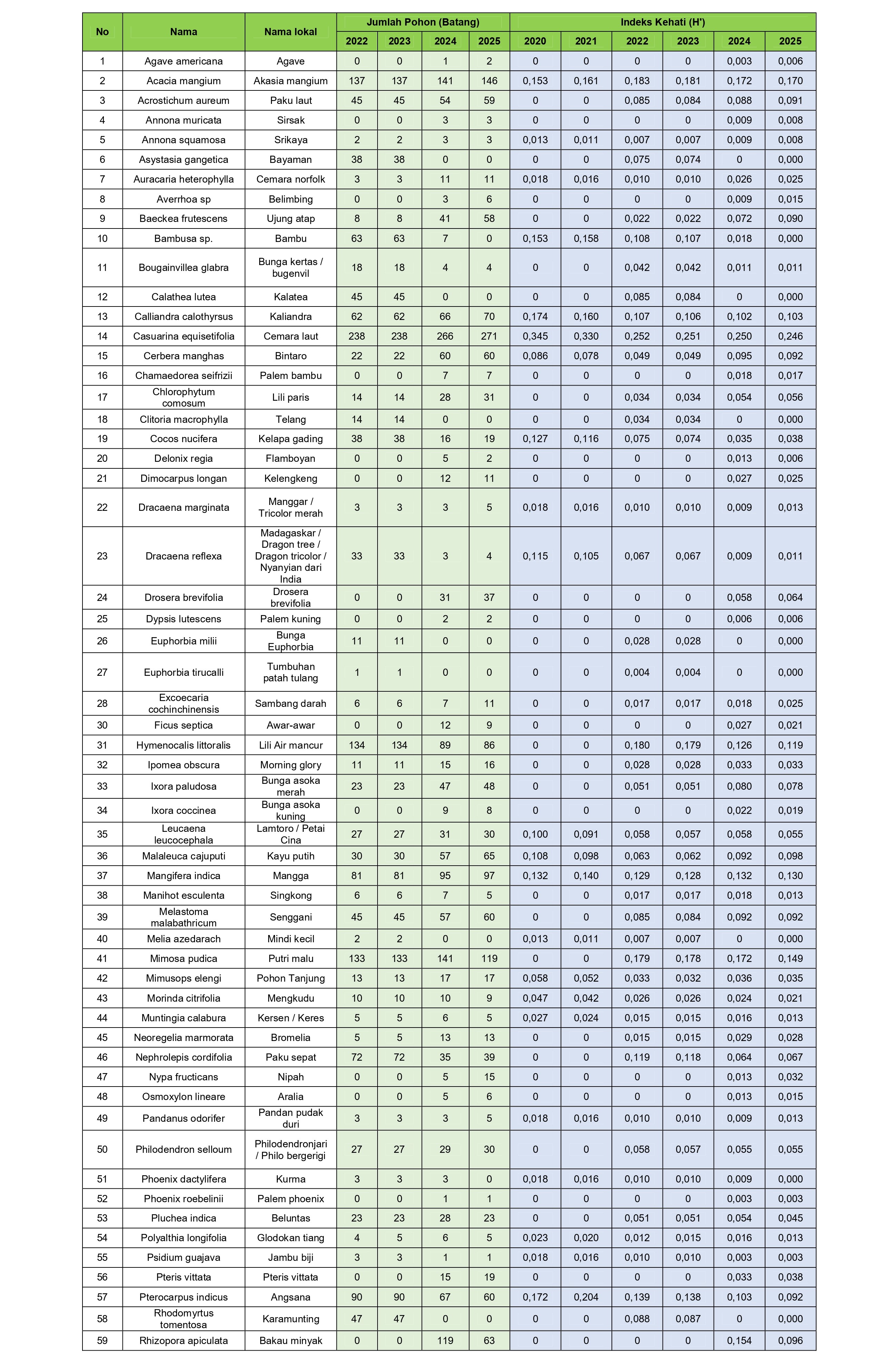 Dari hasil monitoring pada kawasan konservasi, Perusahaan berkomitmen untuk melakukan upaya perlindungan flora maupun fauna seperti Cemara Norfolk (Vulnerable), Angsana (Endangered), dan Mahoni (Near Threatened dan APP II). Data monitoring keanekaragaman hayati disajikan pada tabel sebagai berikut.