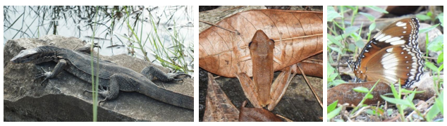 Gambar 2. Keanekaragaman Fauna di Kawasan Konservasi PLTU Bangka (re: Biawak Air Tawar; Katak Pohon Bergaris; Kupu-kupu)