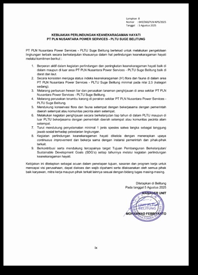 Komitmen Perusahaan dalam mendukung upaya pelestarian keanekaragaman hayati dituangkan dalam Keputusan Manajer Unit PLTU Belitung Nomor : 049/060/PLN-NPS/2025 tentang Kebijakan Pengelolaan Lingkungan dan Corporate Social Responsibility (CSR) PT PLN Nusantara Power Services PLTU Suge Belitung – Lampiran 8. Kebijakan Perlindungan Keanekaragaman Hayati.